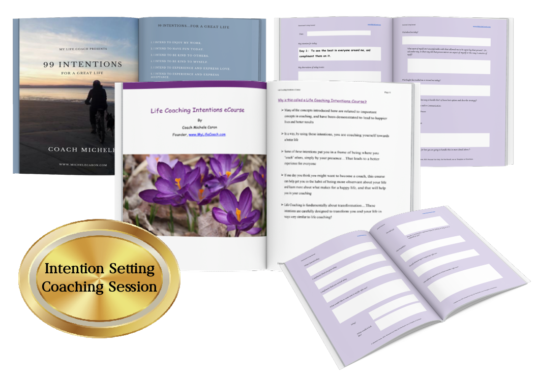 Of course, I know you are thinking it...What about free bonuses? Yes! I have included 3 bonuses that I am really excited about. Bonus #1: Coach Michele's Intentional Living Journal Really, I can't even believe I am including this. I will probably sell this separately at some point, but if you go for it now, you can get it for free! I developed the first version of this journal for my own use. I have revised it and provided instructions and sample entries to make it a powerful tool for *anyone* that wants to develop themselves as a person and have a happier, more successful life. The neatest part is...It works together with the Life Coaching Intentions eCourse, because the intentions are included in the first 30 days of the journal. Then, there are 15 additional days for you to re-use your favorite intentions or design your own. I don't want to give away too much about what is in this journal. Let me say that it has one section to complete in the morning (a daily intention), then several sections to complete at night (it doesn't take too long!) that encourage a daily practice of awareness, growth, observance, learning, compassion and creation in your life. Just using this journal alone could change your life. The journal comes as a super cool, actionable Google Workbook. You can fill and save online, print, copy, anything you like for your personal use. Bonus #2: Intentional Living Journal Refill Pages I am so sure that you are going to love the journal, I have included another Google Workbook ready to easily use with 30 additional days of journal pages. Bonus #3: 99 Intentions...For a Great Life You'll love living an intentional life, and you will be ready for more after the eCourse is complete. I have included a list of 99 additional Intentions! This extensive list should provide lots of great intentions to use in your life, as well as give you ideas for your own powerful intentions. You'll love choosing an intention each day once you see what powerful things you can create when you focus your mind, heart and spirit on an intention! And, in case you still have any reservations, of course, if you don't *love* your eCourse, I will provide you a full refund within 30 days of your purchase. Are you excited? I am too! I know that you can create amazing things in your life using these intentions!